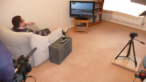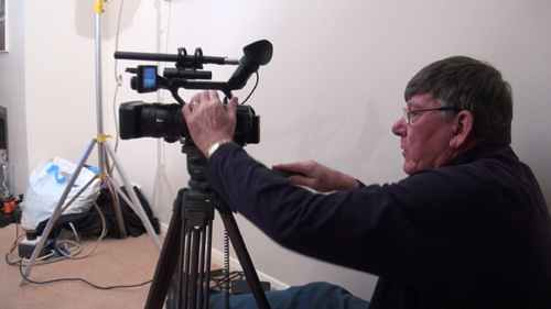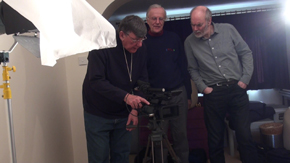 Roger preparing to film the intro scene with Tony and Richard assessing the image