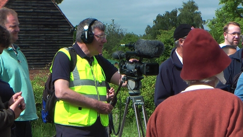 Roger filming a re-enactment of a dispute above the hovel on common land at the Chiltern Open Air Museum event